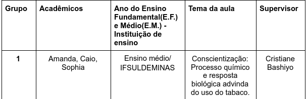 A primeira pauta foi a chamada dos discentes presentes (às 8h50min) e em seguida, iniciou-se as apresentações finais dos projetos para uma feira de ciências pelos alunos pibidianos supervisionados pela professora Cristiane Bashiyo. Os grupos apresentaram o desenvolvimento do projeto e a elaboração de uma atividade interativa, conforme os prazos estabelecidos pelo cronograma de atividades para a elaboração do projeto feira de ciências apresentado pela coordenadora de área Juliana Cristina dos Santos: