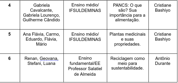 Após as apresentações dos grupos supervisionados pela professora Cristiane Bashiyo, o grupo 6 teve a oportunidade de fazer sua apresentação e ao fim de cada apresentação houveram análises dos supervisores Antônio Durante e Cristiane Bashiyo onde foram feitos comentários positivos e sugestões para melhoria das apresentações, também houve um debate entre os alunos sobre os temas e sugestões dos mesmos para incrementar o trabalho dos grupos.